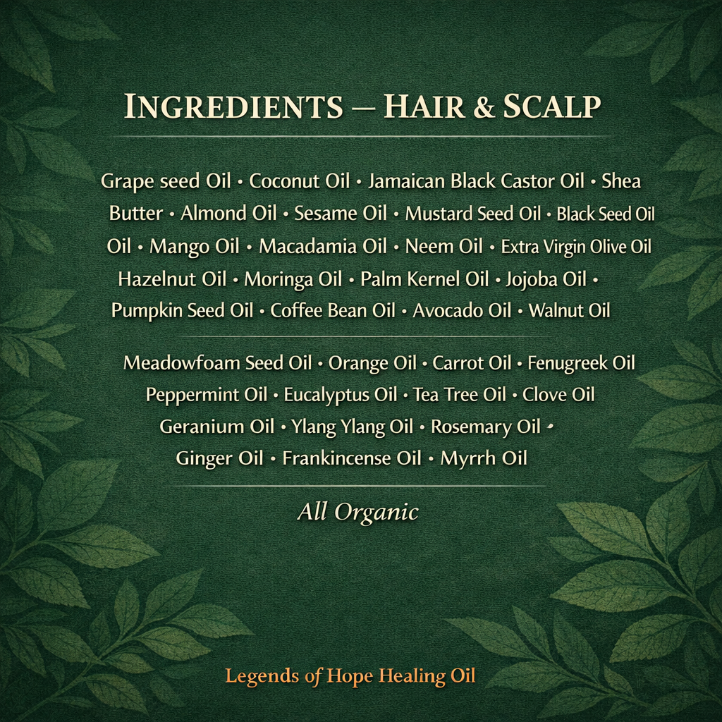 Revitalize your hair and scalp with Legends of Hope Hair & Scalp Restorative Oil Moisturizer — a lightweight, nutrient-rich blend crafted from nature’s purest oils. This formula promotes healthy hair growth, strengthens strands, and helps reduce breakage for fuller, softer hair.